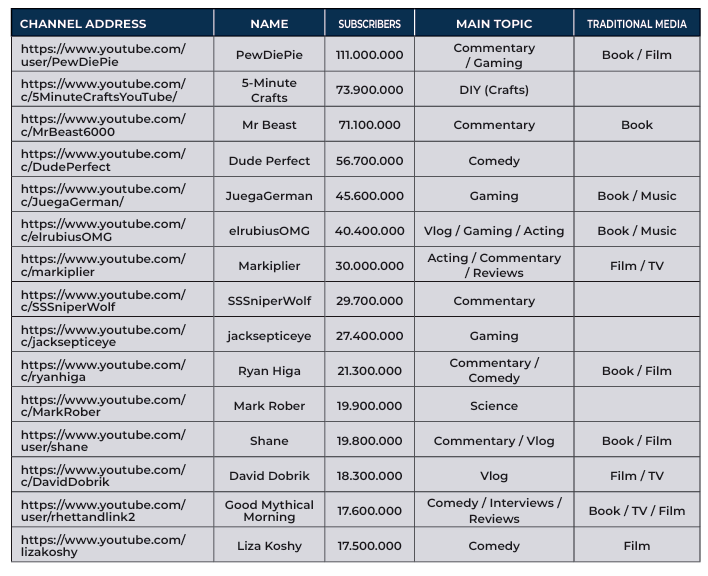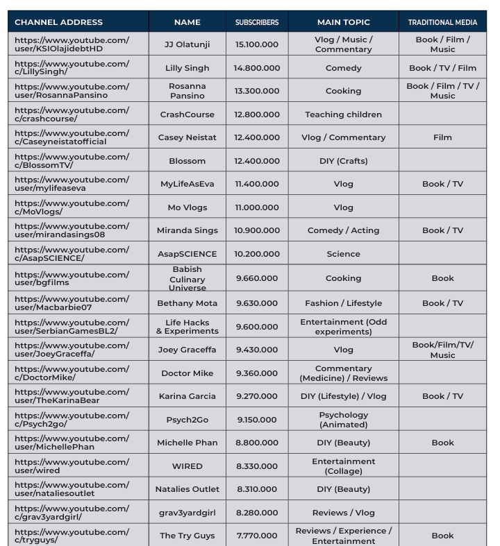 Additional conclusion from the analysis of YouTube channels is that in top 100 YouTube channels, more than half of the content creators, 58% to be exact, after gaining the success on YouTube, has reached for the experience in traditional media (or vice versa). In fact, 31 content creators have started their parallel careers in film or television, but interestingly enough, 41 youtubers from the list of top 100 have published books.