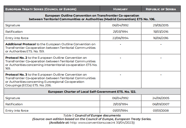 in the cooperation, while the external one is compliance with the standards and frameworks established under the auspices of the Council of Europe: the Madrid Convention and its annexes outlining two types of cross-border cooperation opportunities: agreements between intergovernmental and local or regional authorities.