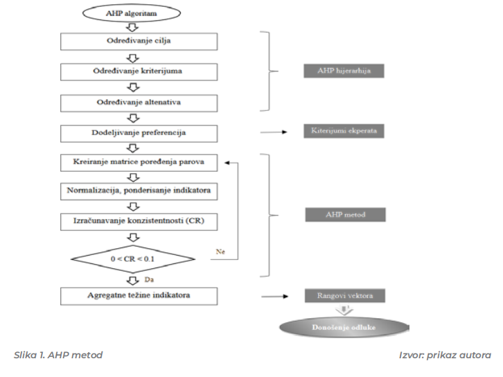 Proces analitičke hijerarhije (AHP) je najpoznatiji metod iz arsenala višekriterijumskog odlučivanja (MCDM). Veoma složena hijerarhijska struktura metoda pokazala se kao odličan alat u procesu donošenja odluka. Iako se radi o složenoj strukturi, to je ujedno predstavlja i najveću prednost metoda višekriterijumskog odlučivanja. Naime, struktura je tako koncipirana da omogućava transformaciju u skladu sa potrebama istraživanja, sa problemom koji se razmatra, brojem nivoa kroz koji se vrši uparivanje, poređenja, kao i broja elemenata po različitim