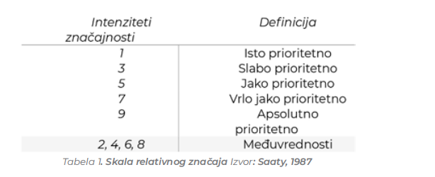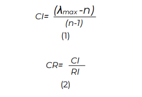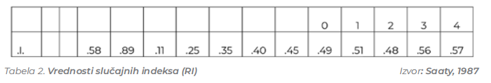 gde je RI slučajni indeks (indeks konzistencije matrice veličine n slučajno generisanih poređenja parova). Izračunate vrednosti slučajnog indeksa prikazane su u tabeli 2.
