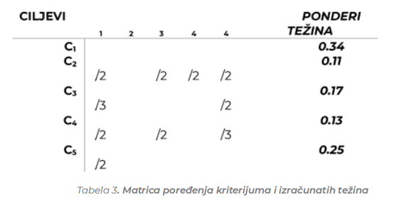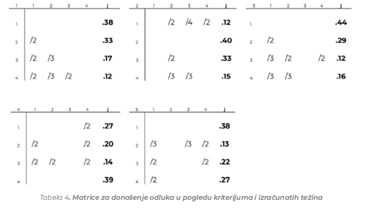 Sledeći korak u konceptu AHP metoda, vršeno ocenjivanje varijanti prema svakom od kriterijuma pojedinačno. Tabela 4. pokazuje matrice poređenja varijanti u odnosu na pet kriterijuma i odgovarajući težinski vektori.