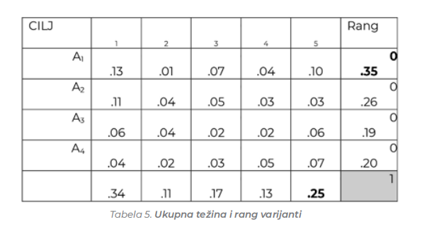 alternativa u odnosu na cilj. Ovo se jednostavno radi preko proizvoda težina (Pj). Na kraju postupka sprovodi se ukupna sinteza problema izbora, nakon čega je moguće izvršiti rangiranje pokazatelja za lokalnu zajednicu (Tabela 5). Donošenje konačne odluke, tj. odabir optimalnog modela upravljanja pronalazimo u alternativi najvećoj po vrednosti ranga koja ima najveću ukupnu težinu.
