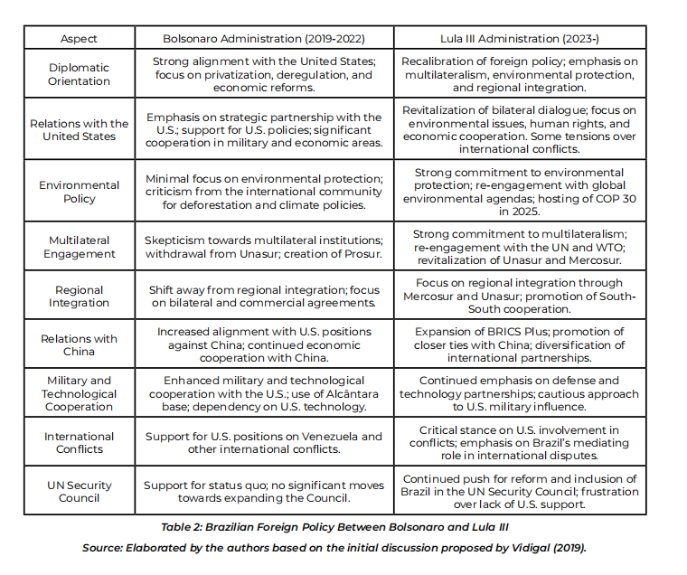 p. 82). This scenario is linked not only to internal conditions but also to the external context: following Trump’s defeat to Joe Biden in the 2020 elections, some analysts argued that Brazil’s distancing from its tradition of supporting multilateralism had become less viable, including due to potential American pressures (Hirst & Maciel, 2022).