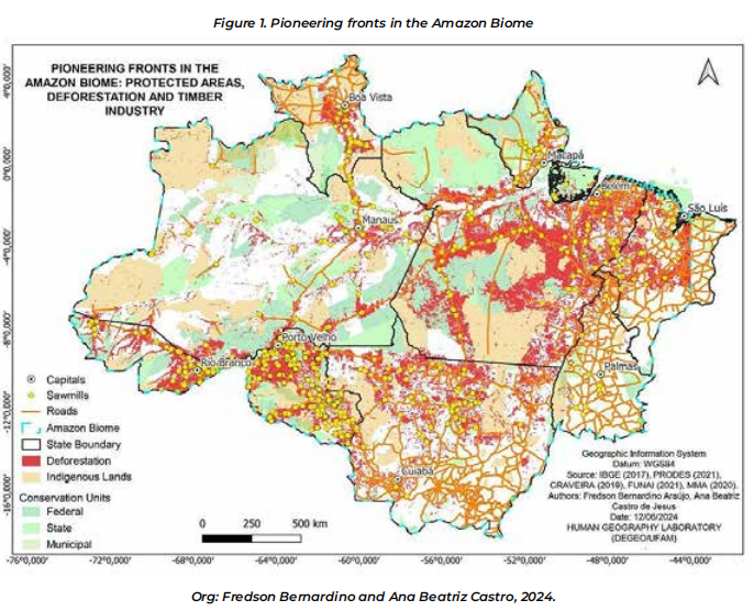 In the contemporary period, conflicts, and tensions in the territorial area of the Amazon are primarily concentrated in the southern portion of the state. Here, ongoing transformations driven by the advance of pioneering settlement fronts focused on space appropriation for production or land speculation, are particularly notable. These dynamics characterize the changes occurring within this pioneering frontier (CASTRO DE JESUS et al., 2023a; OLIVEIRA NETO, 2024). One indicator of pioneering fronts in the Amazon is the presence of legal or illegal corporations engaged in logging and processing wood from the Amazon rainforest.