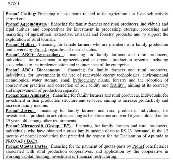 The Ministry of Agrarian Development (MDA) was converted into the Special Secretariat for Family Agriculture and Agrarian Development of the Civil House of the Presidency of the Republic (Sead) in 2016, being extinguished in 2019 and recreated in 2023. Currently, the MDA specifies nine subprograms, which can be financed via PRONAF with specific destinations, as, explained in BOX 1.