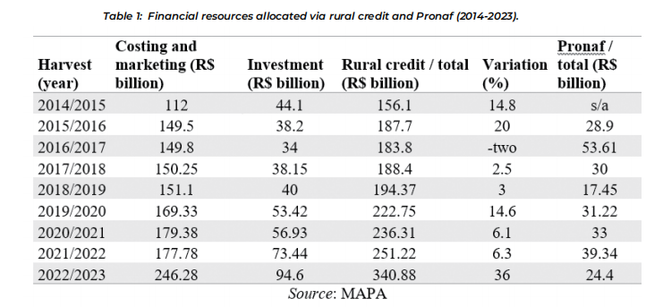 Between the years 2015 and 2023, the financial resources allocated via Rural Credit to agribusiness and PRONAF to promote family farming can be seen in Table 1.