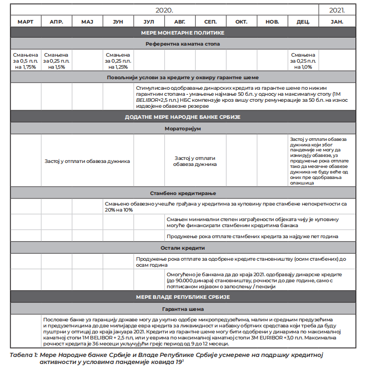 U Tabeli 1. predstavljene su mere Narodne banke Srbije i Vlade Republike Srbije u vremenskom periodu od početka pandemije do januara 2021. godine. Osim mera monetarne politike koje su podrazumevale smanjenje referentne kamatne stope, sprovedene su i dodatne mere uvođenja moratorijuma, zastoja u otplati obaveza dužnika, mere povoljnijeg stambenog i ostalog kreditiranja. Nekoliko puta je isplaćivana i jednokratna pomoć svim građanima koji su se prijavili.
