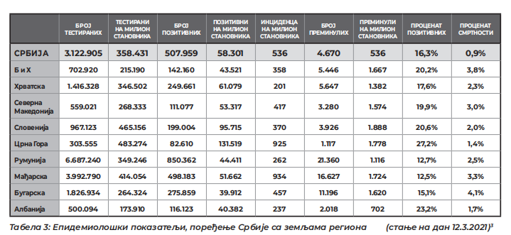 Na osnovu Tabele 3. može se zaključiti da Srbija u odnosu na zemlje iz okruženja ima najmanji procenat smrtnosti u apsolutnim i relativnim pokazateljima. To je pokazatelj efikasnosti zdravstvenog sistema.