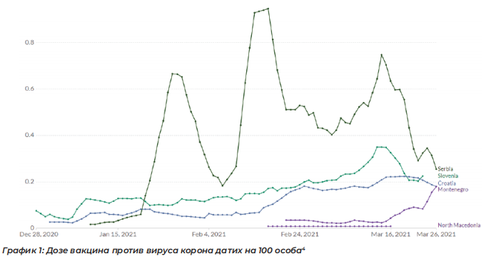 Na osnovu Grafika 1. može se zaključiti da se u Srbiji proces imunizacije sprovodi najbolje u odnosu na sve zemlje iz okruženja. Nepoverenje pacjenata u imunizaciju je prisutno zbog straha od kontraindikacija koje vakcine mogu imati.